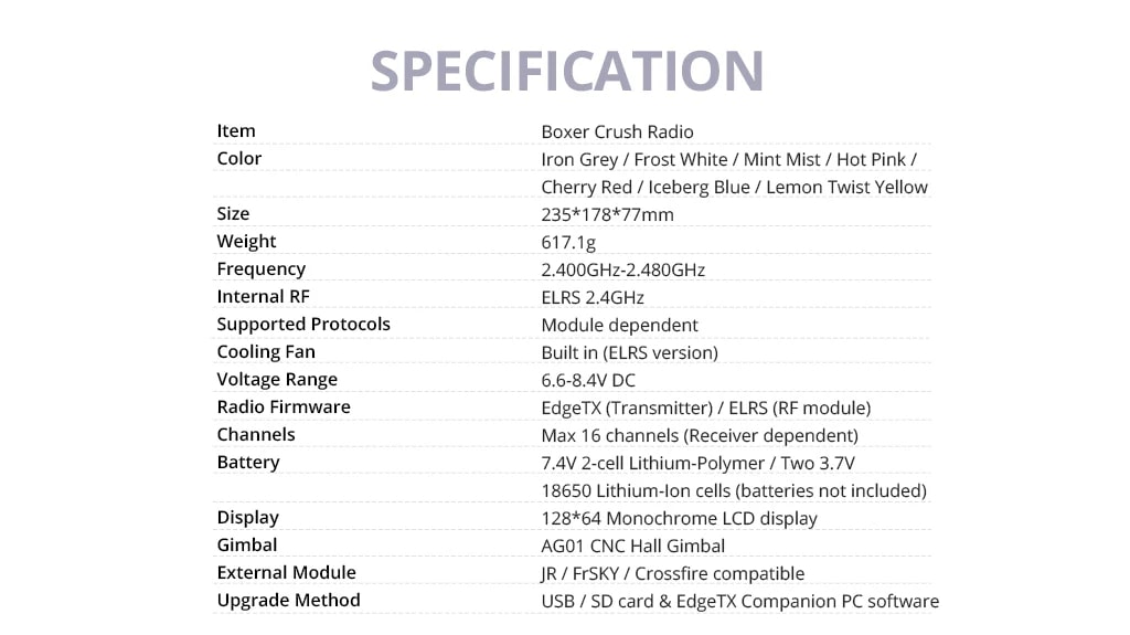 RadioMaster Boxer Crush сочетает практичную платформу Boxer с предустановленными EdgeTX и ExpressLRS, точными AG01 гимбалами и гибкостью по модулям через JR-отсек, добавляя к этому яркие варианты корпуса и детали, удобные для повседневного использования и перевозки. Это решение для тех, кто хочет функциональный пульт без долгой подготовки и при этом стремится выделить свой комплект.