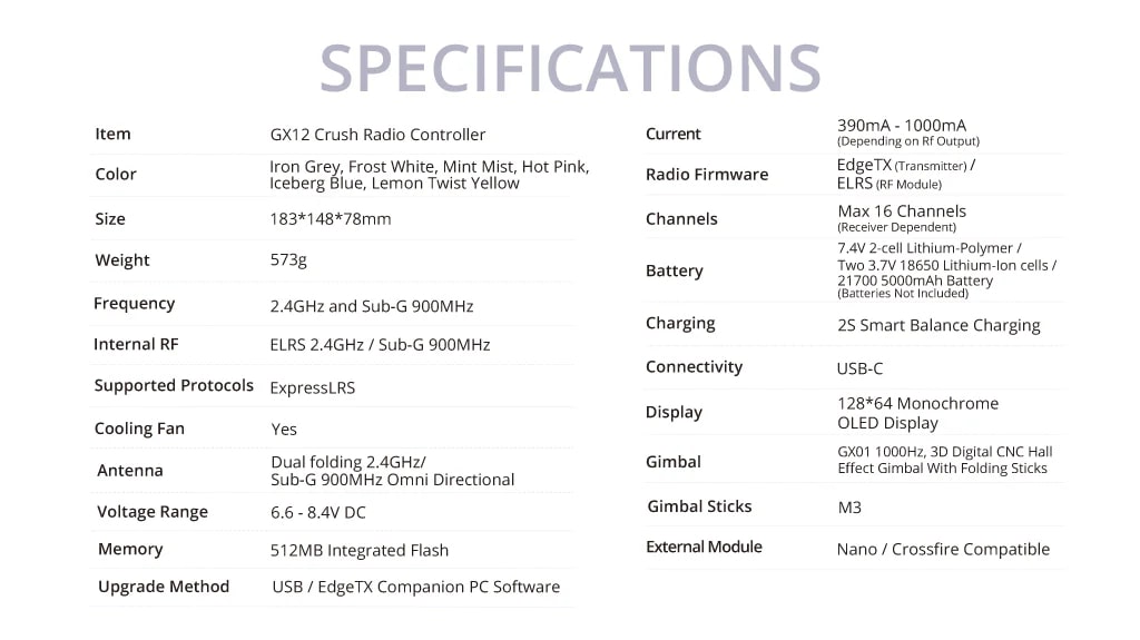 GX12 Crush Edition сочетает в себе функционал профессионального радиоконтроллера, передовые технологии двухдиапазонной связи и уникальный дизайн. Это не просто обновление, а полноценный инструмент для пилотов, которым важны стабильность линка, точность управления и возможность выразить индивидуальность. GX12 Crush — выбор тех, кто хочет максимум от ExpressLRS и не готов идти на компромиссы.
