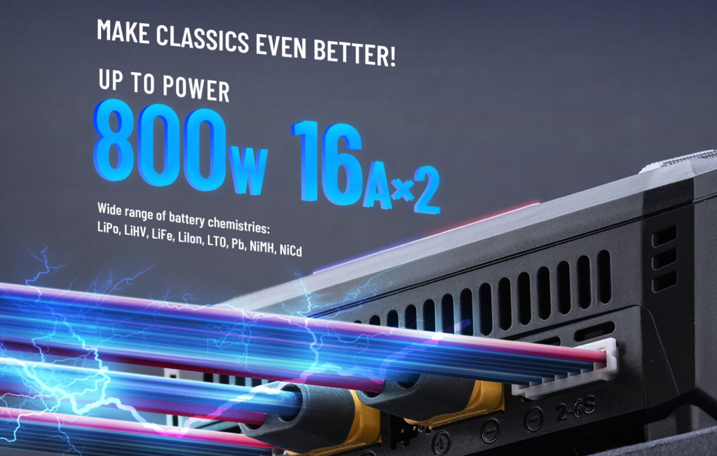 - Поддержка разных аккумуляторов: LiPo / LiHV / LiFe / LiIon / LTO / NiMH / NiCd