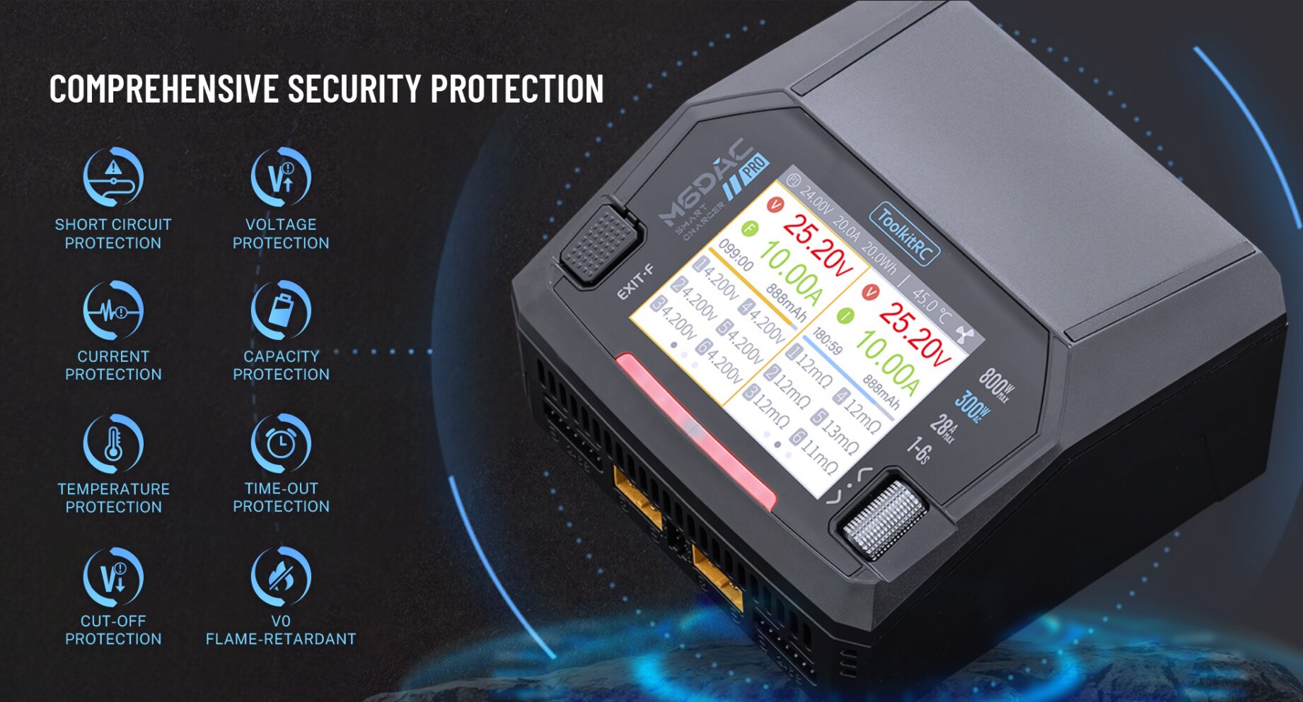 ToolkitRC M6DAC Pro — новая версия двухканальной зарядки, где сделали упор на мощность, компактность и удобные мелочи для повседневной работы. Она дает до 800W и 16A ×2, умеет автоматически распределять мощность между каналами, показывает все на 2.8" IPS дисплее и сама управляет охлаждением.