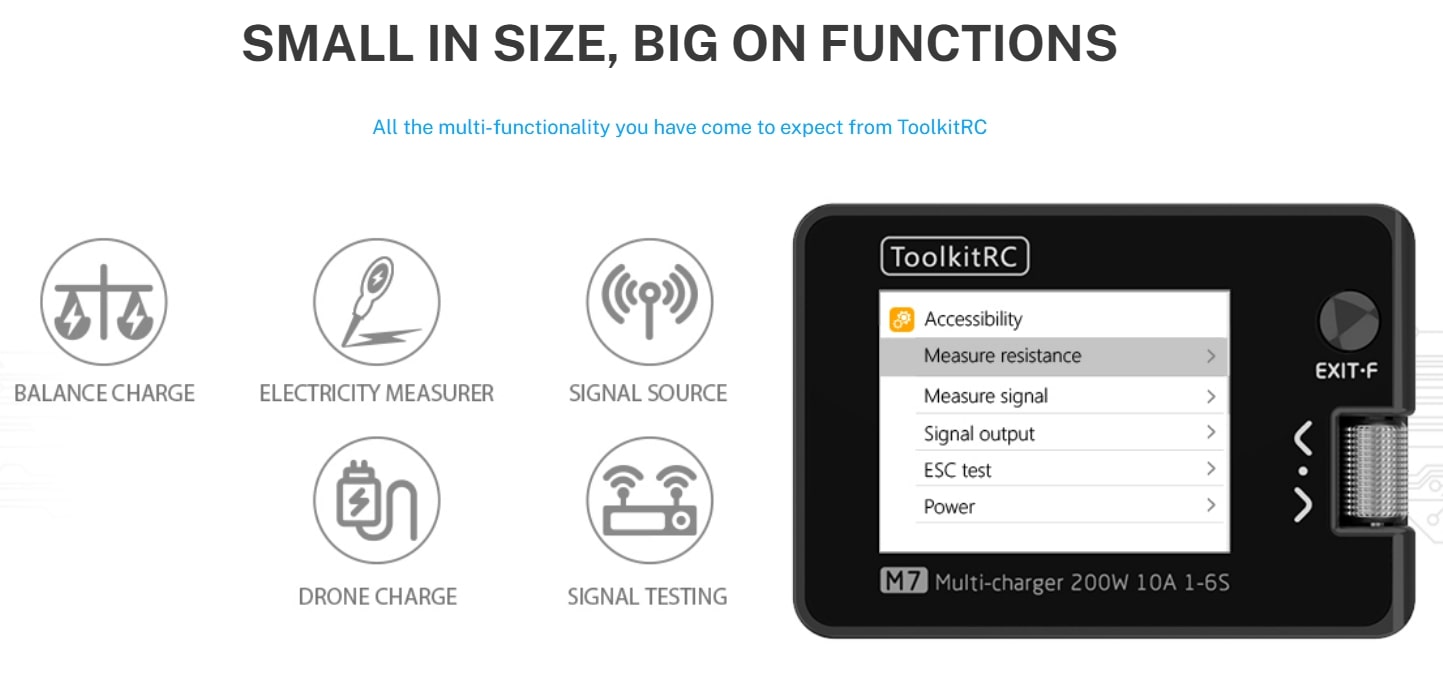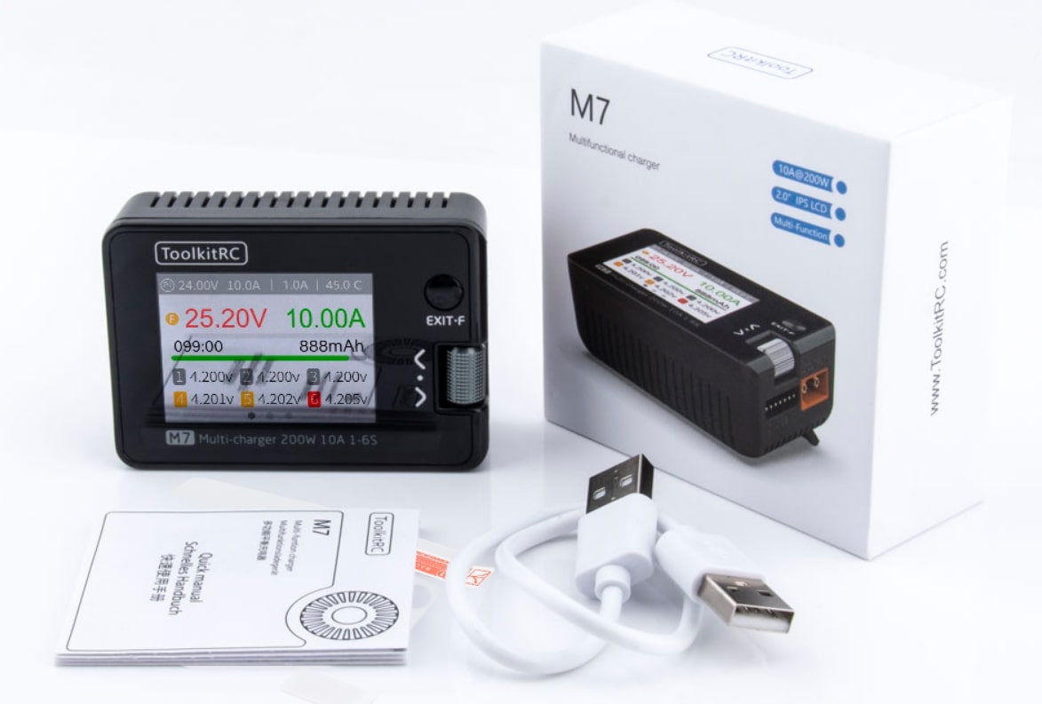 ToolkitRC M7 объединяет функциональность лабораторного тестера и производительного зарядного устройства. Компактный, точный и надежный, он станет универсальным инструментом для FPV-пилотов, инженеров и любителей радиоуправляемой техники.