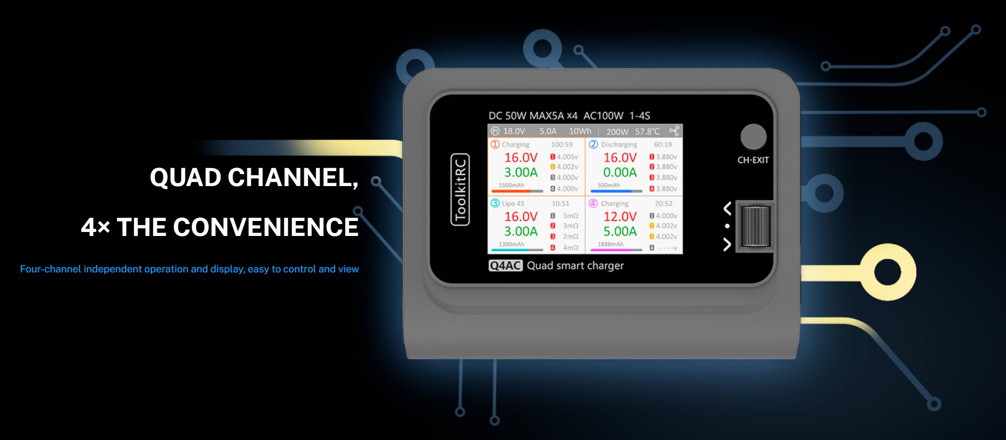 ToolkitRC Q4AC — компактная 4-канальная зарядка, где каждый канал работает и отображается отдельно: удобно одновременно обслуживать разные аккумуляторы и сразу видеть, что происходит на каждом слоте. Питается от сети (внутри уже есть AC-блок на 100W) или от внешнего DC-источника до 200W — под задачи, где нужна большая суммарная мощность.